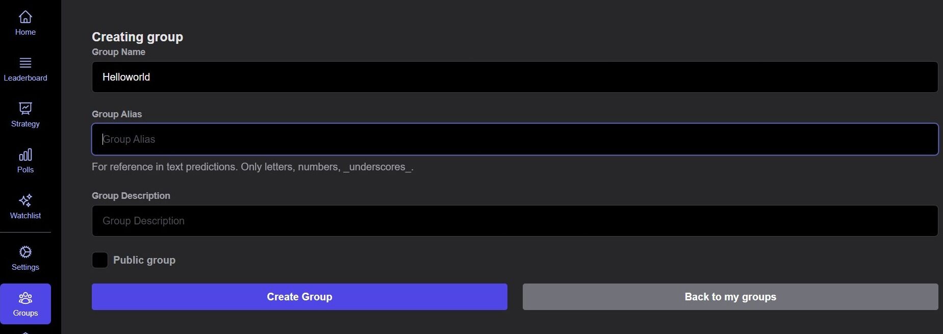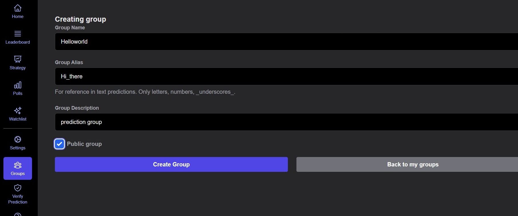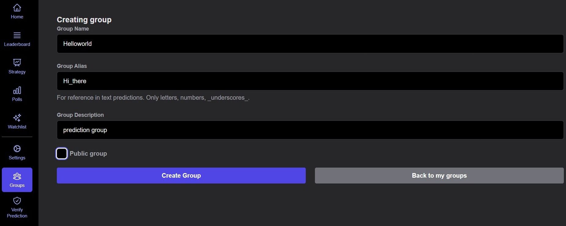 - This group alias is unique to your group and will be required when placing group predictions