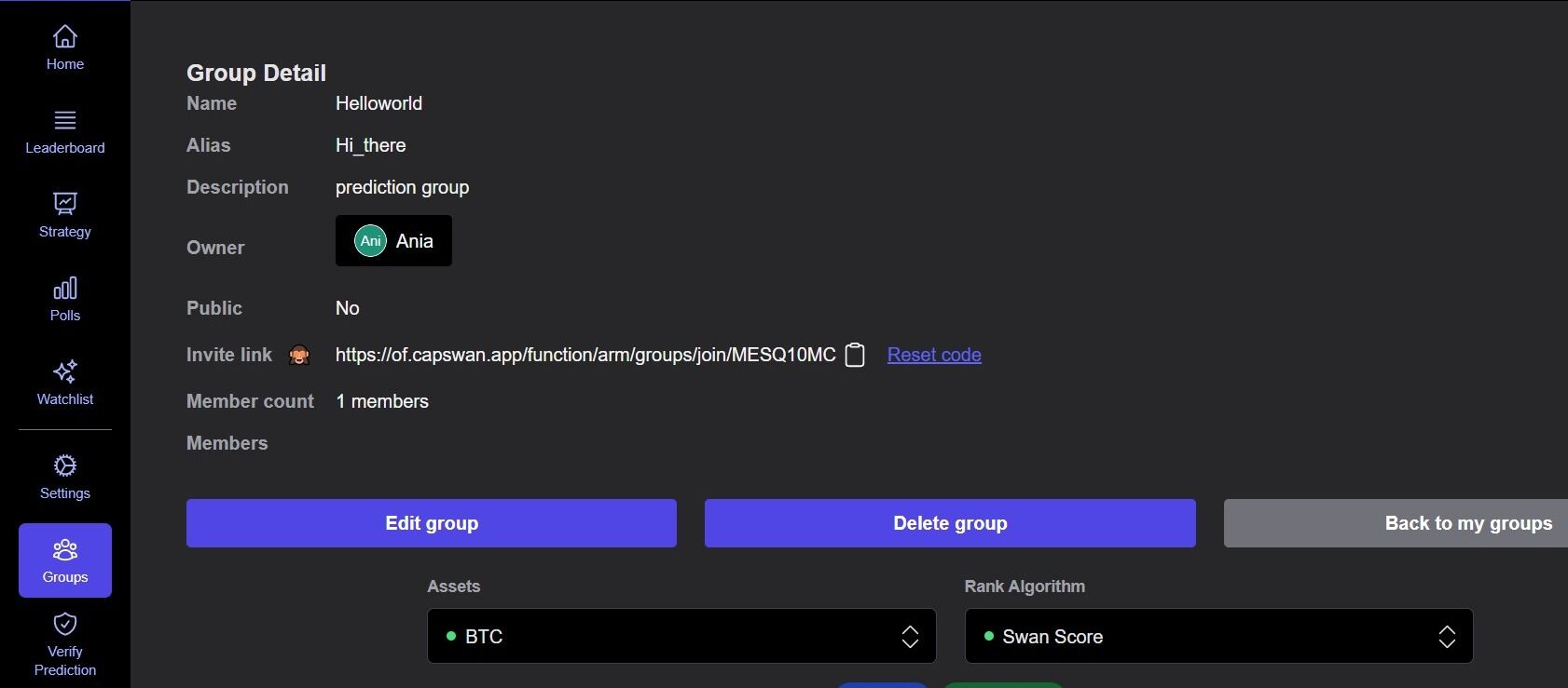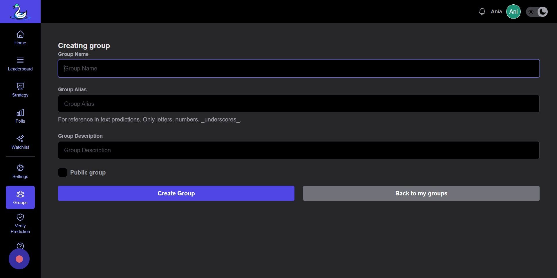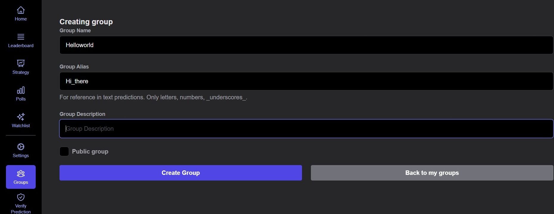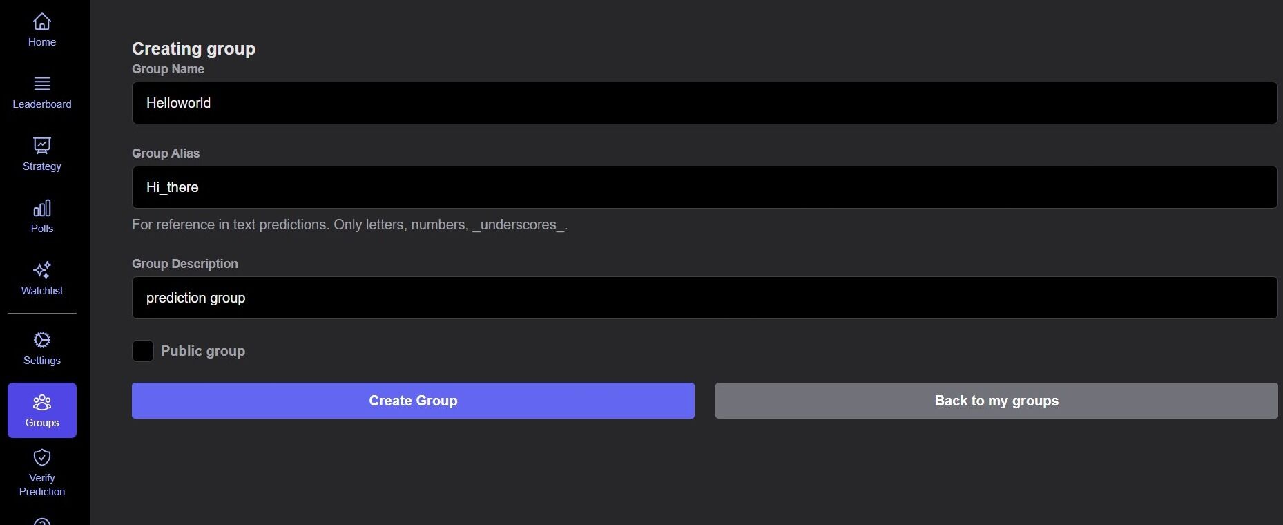 - This group alias is unique to your group and will be required when placing group predictions