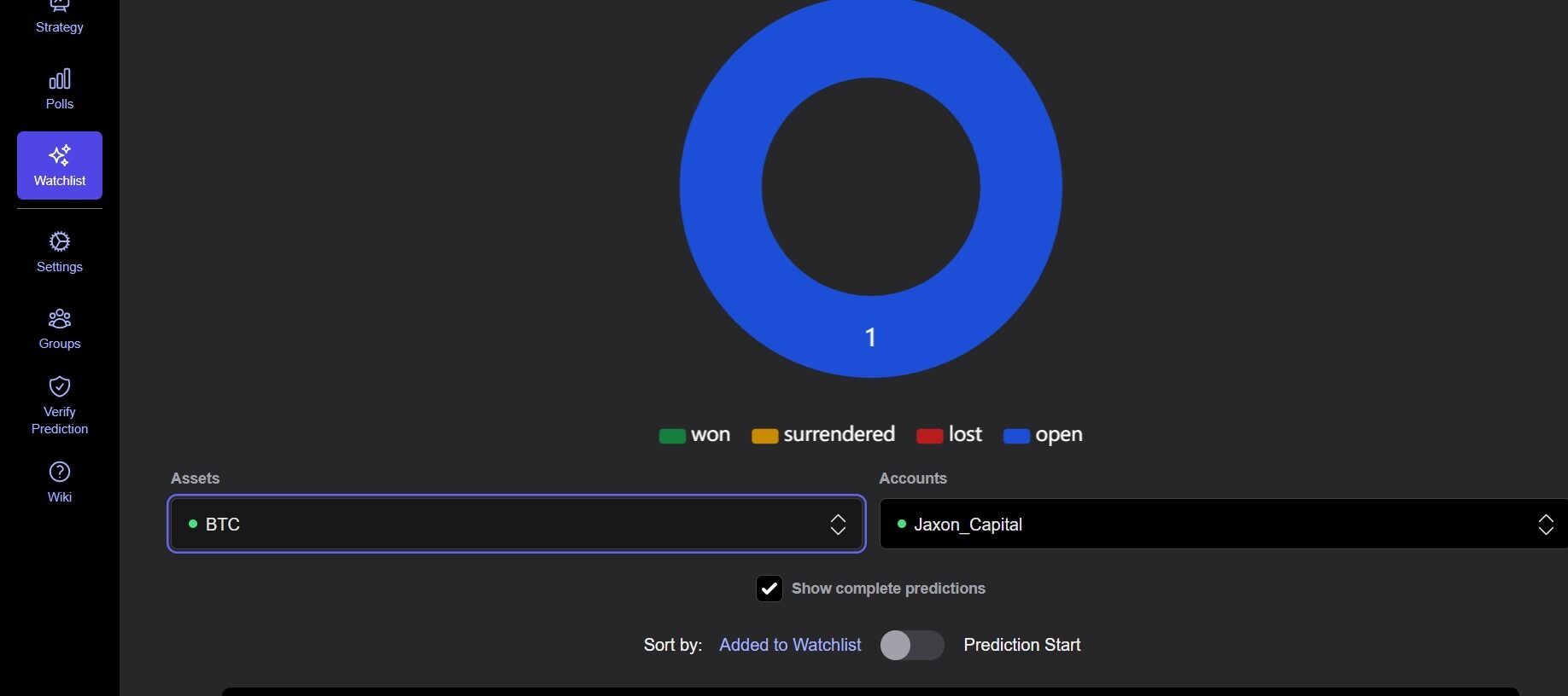 3. You will be shown an overview for the positions you have added to your Watchlist. You can sort the predictions based on Asset and User.